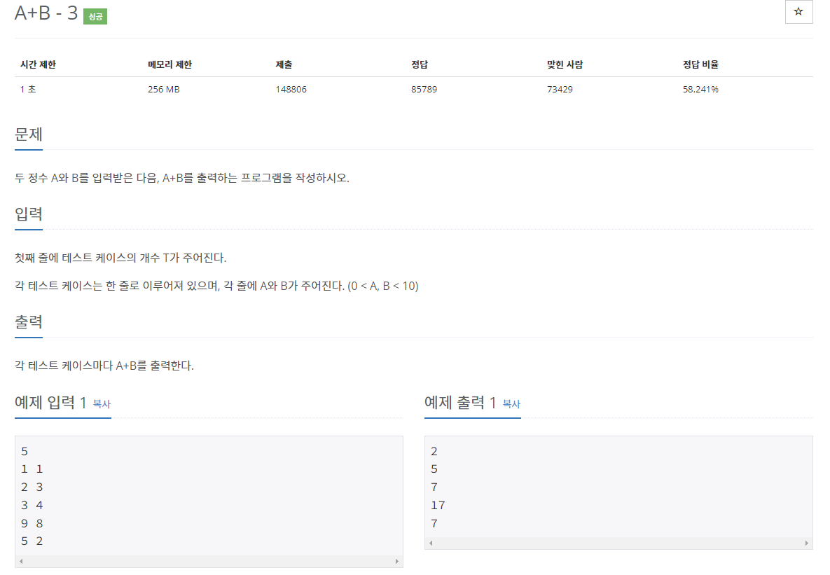 테스트를 반복할 숫자를 입력받은 후에 입력받은 수만큼 for문을 이용해 입력받은 두 정수의 합을 출력해주는 문제이다.