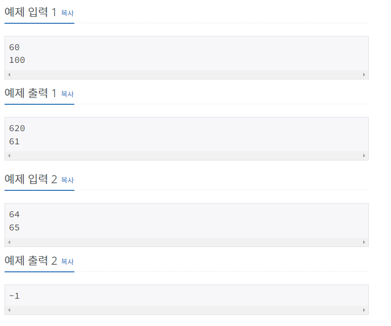결국 for문에서 소수인지 판별을 해서 소수가 맞다면 prime_num이라는 리스트에 값을 추가해주고 마지막 if 조건문을 통해서 리스트 길이가 0이면 -1을 출력하고 리스트가 안비워져 있다면 소수들의 총합과 그 중에서 최소값을 출력해주도록 하였다.