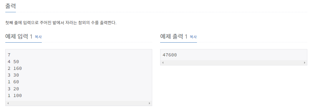 마지막으로 큰사각형 넓이에서 작은 사각형 넓이를 빼준 후 처음에 제곱미터당 입력받은 참외 수확 갯수를 곱해주면 최종답이나온다