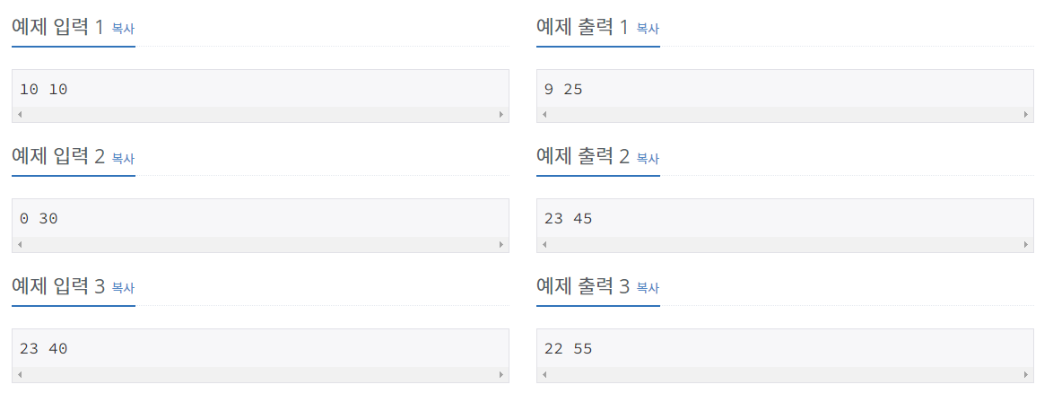 그래서 첫번째로 생각한 코드는 시간과 분을 입력받아 시간에 60을 곱해주어서 45를 빼고나서 60으로 나눈 몫을 시간으로 나머지를 분으로 출력해주는 방식으로 구현해 보았는데 입출력 값 그래도 나와서 백준에 제출했는데 틀렸다고 나왔다....ㅠㅠ