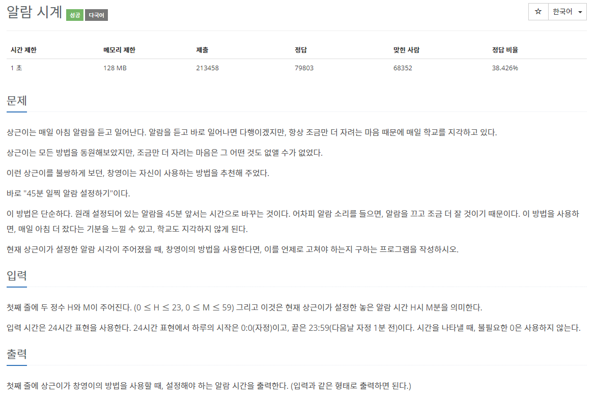 [백준 2884번 문제] 알람 시계 알람 맞출시간과 분을 입력받아서 그 시간보다 45분 전의 시간에 알람을 맞추는 문제이다. 키보드로 입력받아서 45분만 계산해주는 간단한 문제일것 같았지만 생각보다 복잡했다. 0을 입력한 경우에는 24시간제로 계산해서 풀어주어야했다. 그래서 첫번째로 생각한 코드는 시간과 분을 입력받아 시간에 60을 곱해주어서 45를 빼고나서 60으로 나눈 몫을 시간으로 나머지를 분으로 출력해주는 방식으로 구현해 보았는데 입출력 값 그래도 나와서 백준에 제출했는데 틀렸다고 나왔다....ㅠㅠ hour, minute = map(int,input().split()) if 0 백준 문제풀이 2022.01.10
