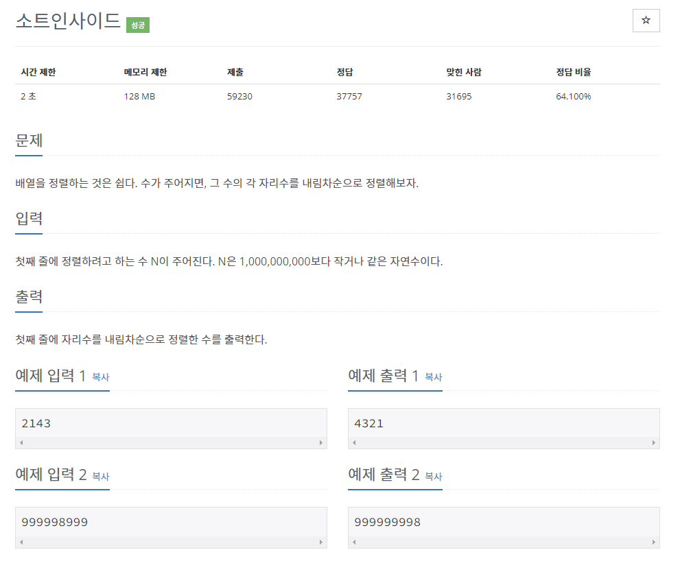 이 문제는 주어진 숫자를 각 자리수를 내림차순으로 정렬하는 문제이다.